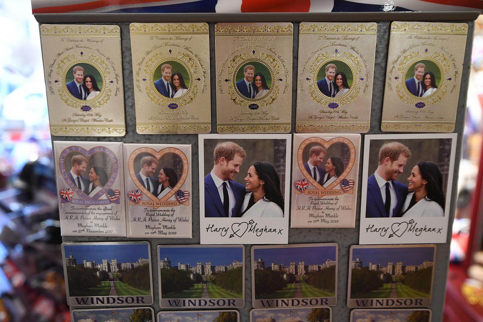 Royal wedding themed fridge magnets are displayed in a store in Windsor, on May 14, 2018.
