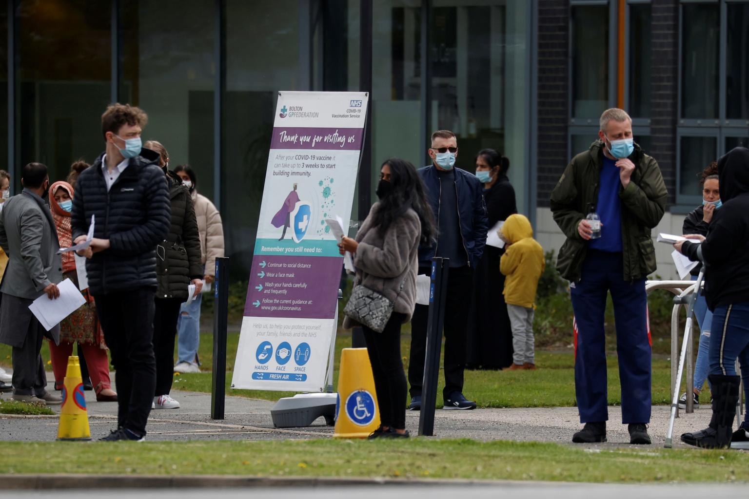 People line up outside a mobile vaccination centre in Bolton, Britain, on May 13, 2021.