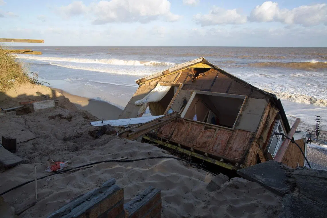 A chalet home that was drawn into the sea during a tidal surge at Hemsby, in the east of England, on Dec 6, 2013.