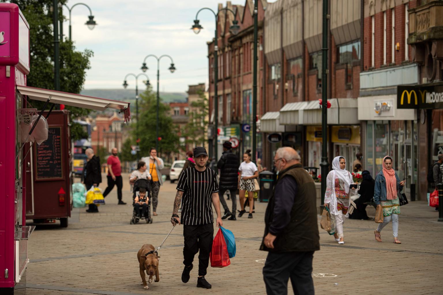 Shoppers make their way through the town centre in Oldham, England, on July 30, 2020.