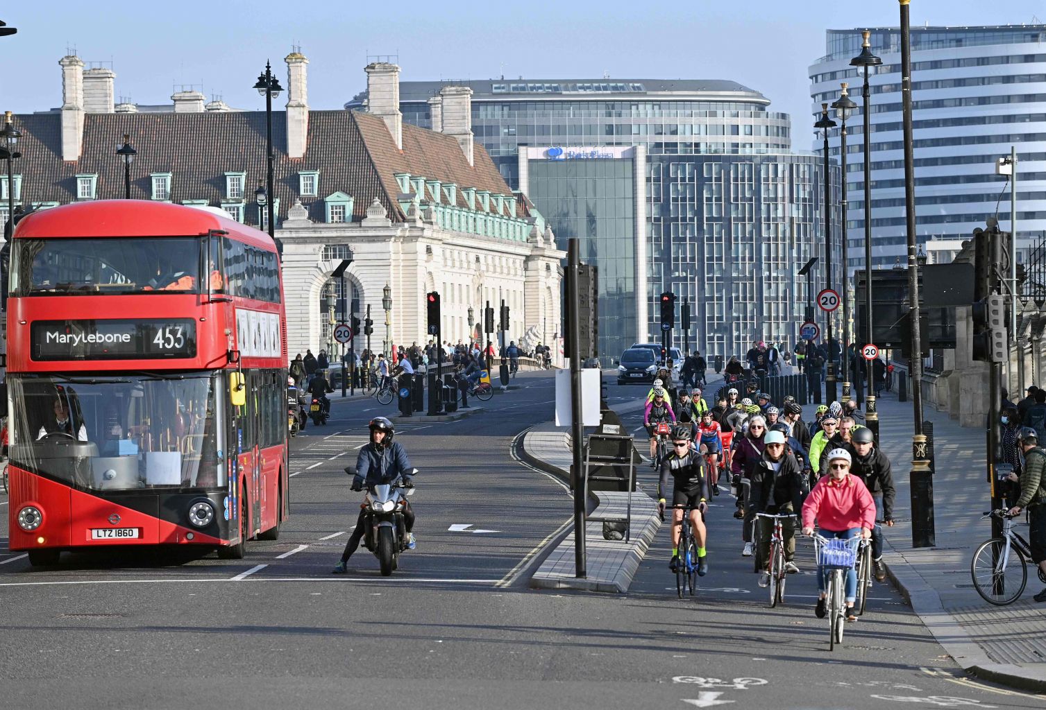 People ride bicycles as they cross Westminster Bridge into Parliament Square in London on Nov 7, 2020.