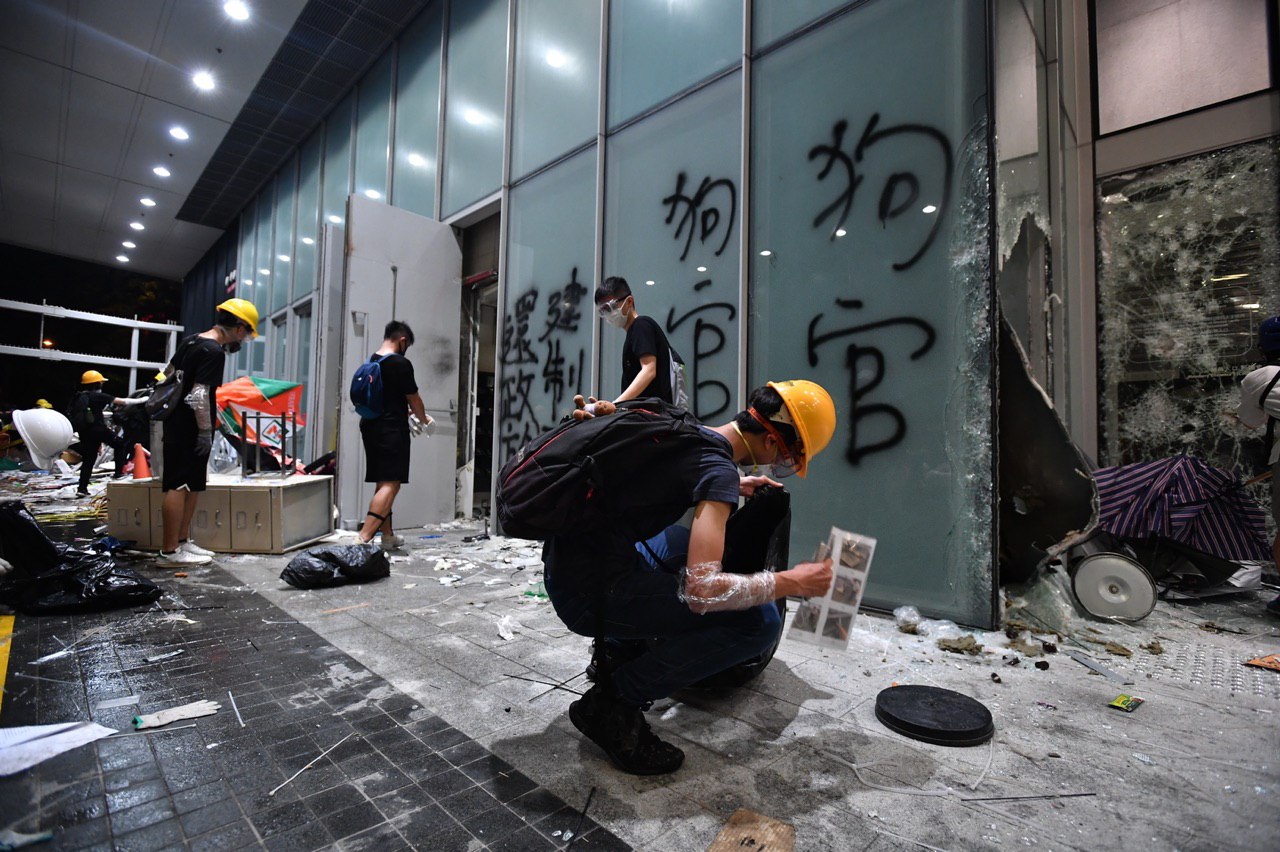 Protesters cleaning up at the entrance of the Legislative Council Complex on July 1, 2019.