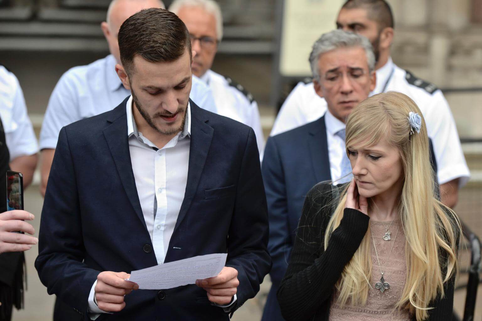 Chris Gard (left) and Connie Yates, the parents of terminally ill infant Charlie Gard, reading a statement in London on July 24, 2017.