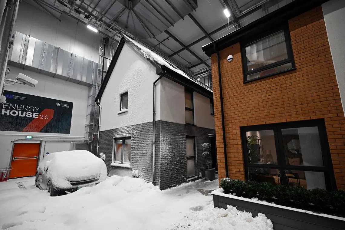 Simulated snow covers the walls of houses built to develop future heating solutions, at Energy House 2.0 in north-west England, on Jan 24, 2023.