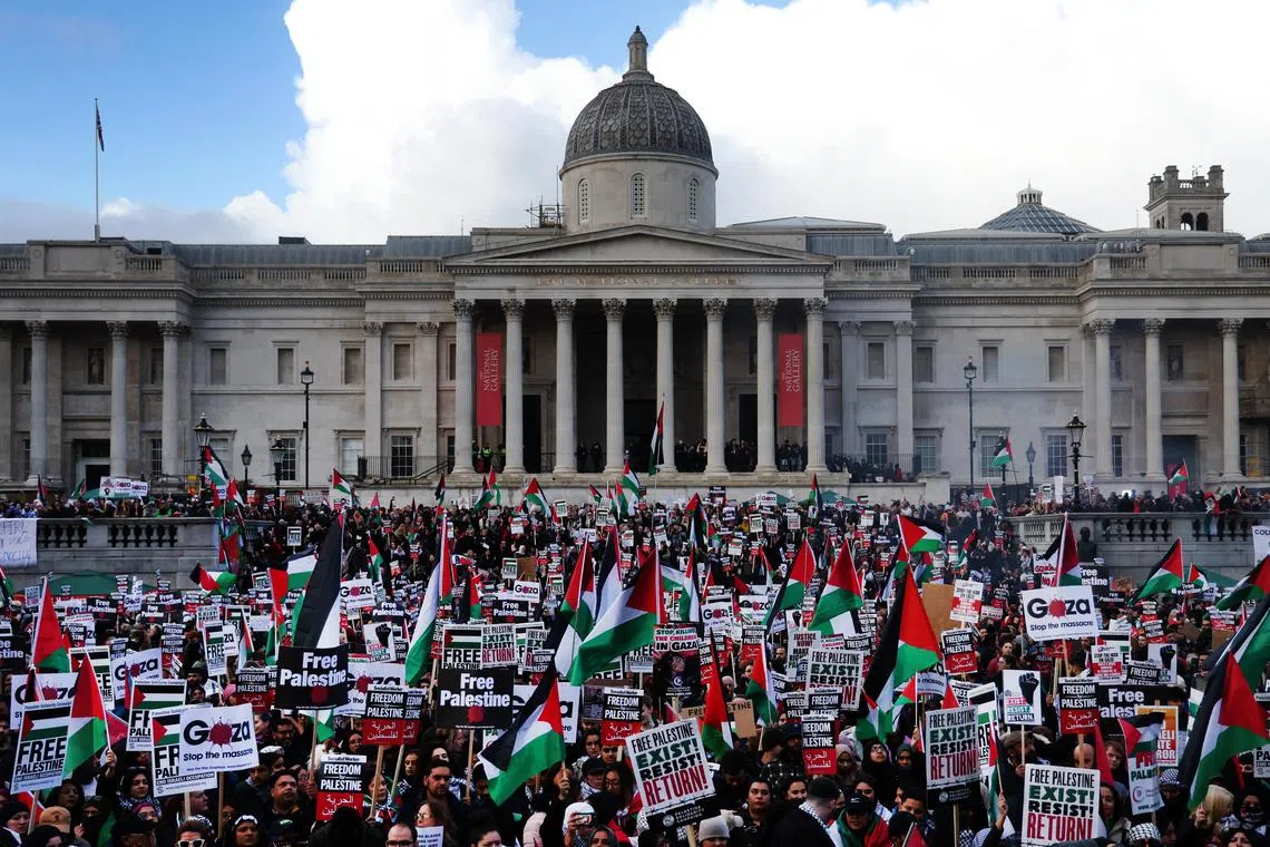 Pro-Palestinian protesters holding placards and Palestinian flags rally in London’s Trafalgar Square.
