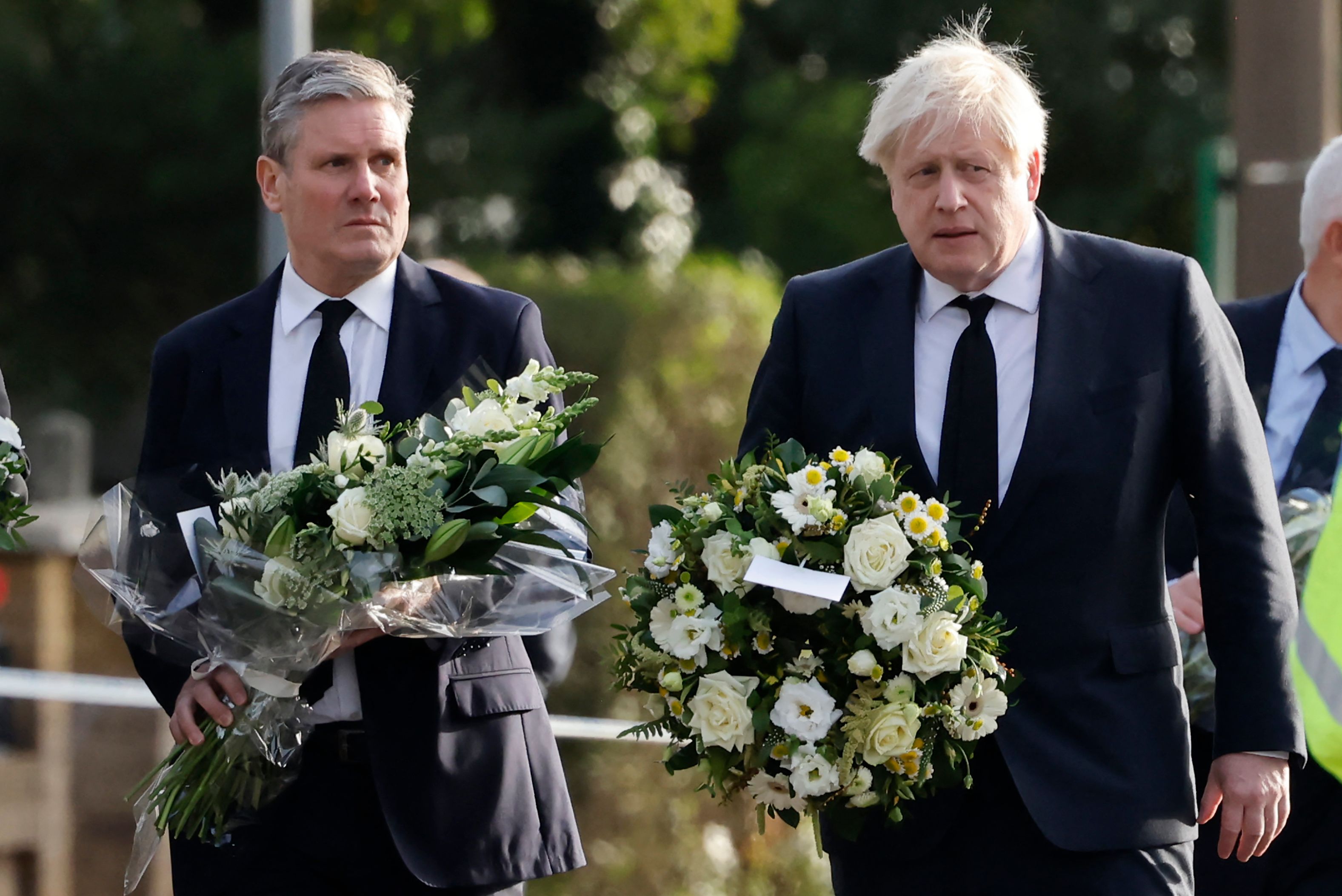 Mr Johnson and Mr Starmer stood side by side in a moment of silence before leaving. Other politicians, police representatives and members of the public came to lay flowers and pay respects.