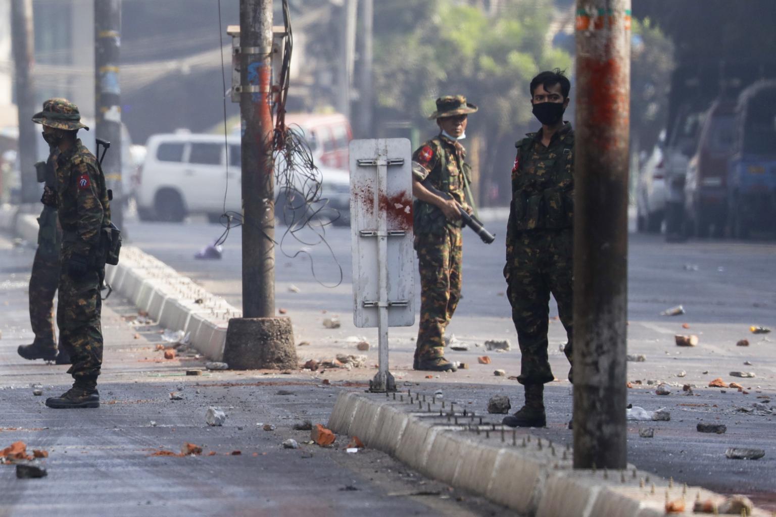 Armed troops standing guard on a road in Yangon, Myanmar, on March 31, 2021.
