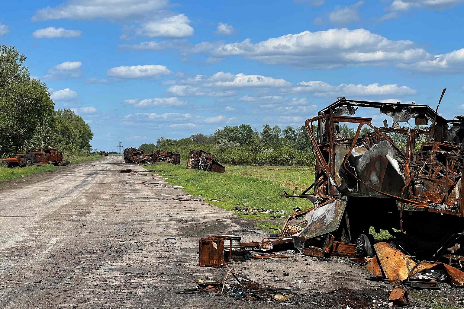 Russian military vehicles destroyed on a road near the village of Kutuzivka, Kharkiv, on May 27, 2022.