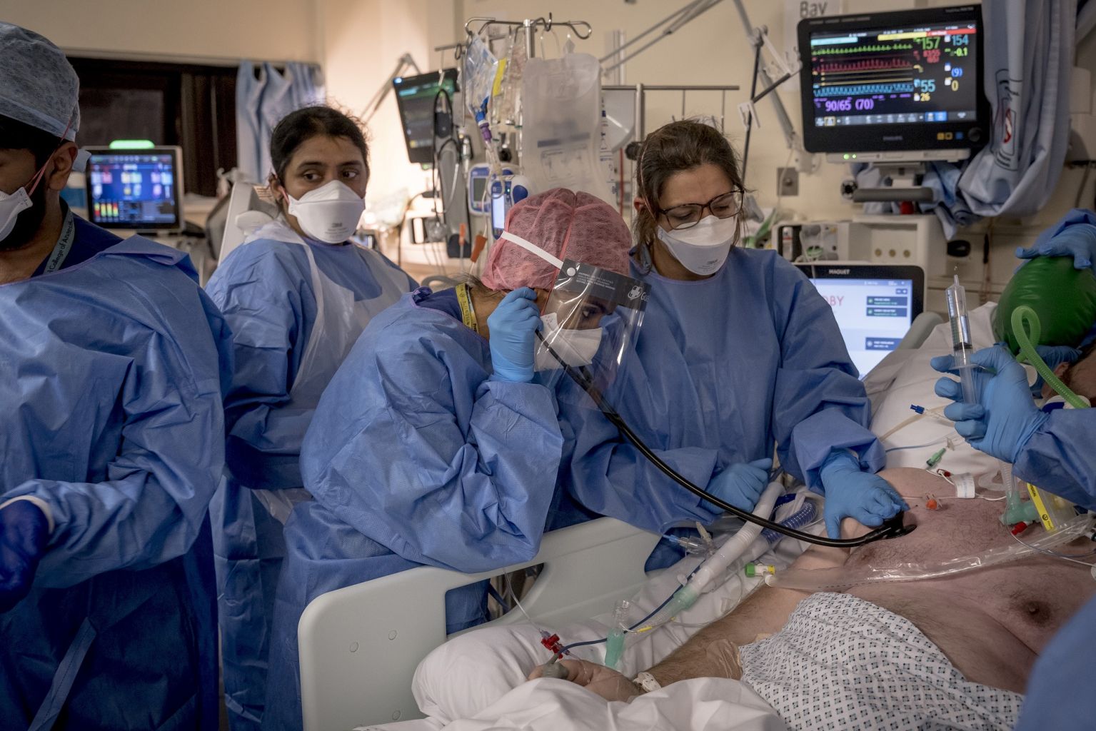 Medical staff listen to the lungs of a Covid-19 patient at a hospital in London in January 2021.