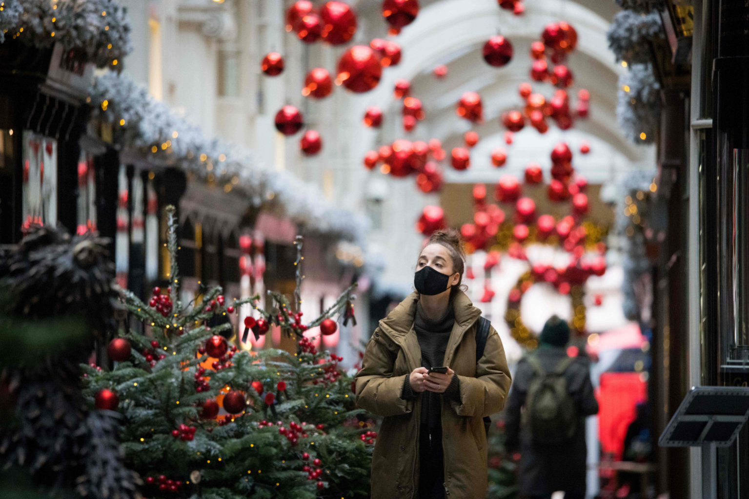 A woman walks past Christmas-themed window displays inside Burlington Arcade in London, on Nov 23, 2020.