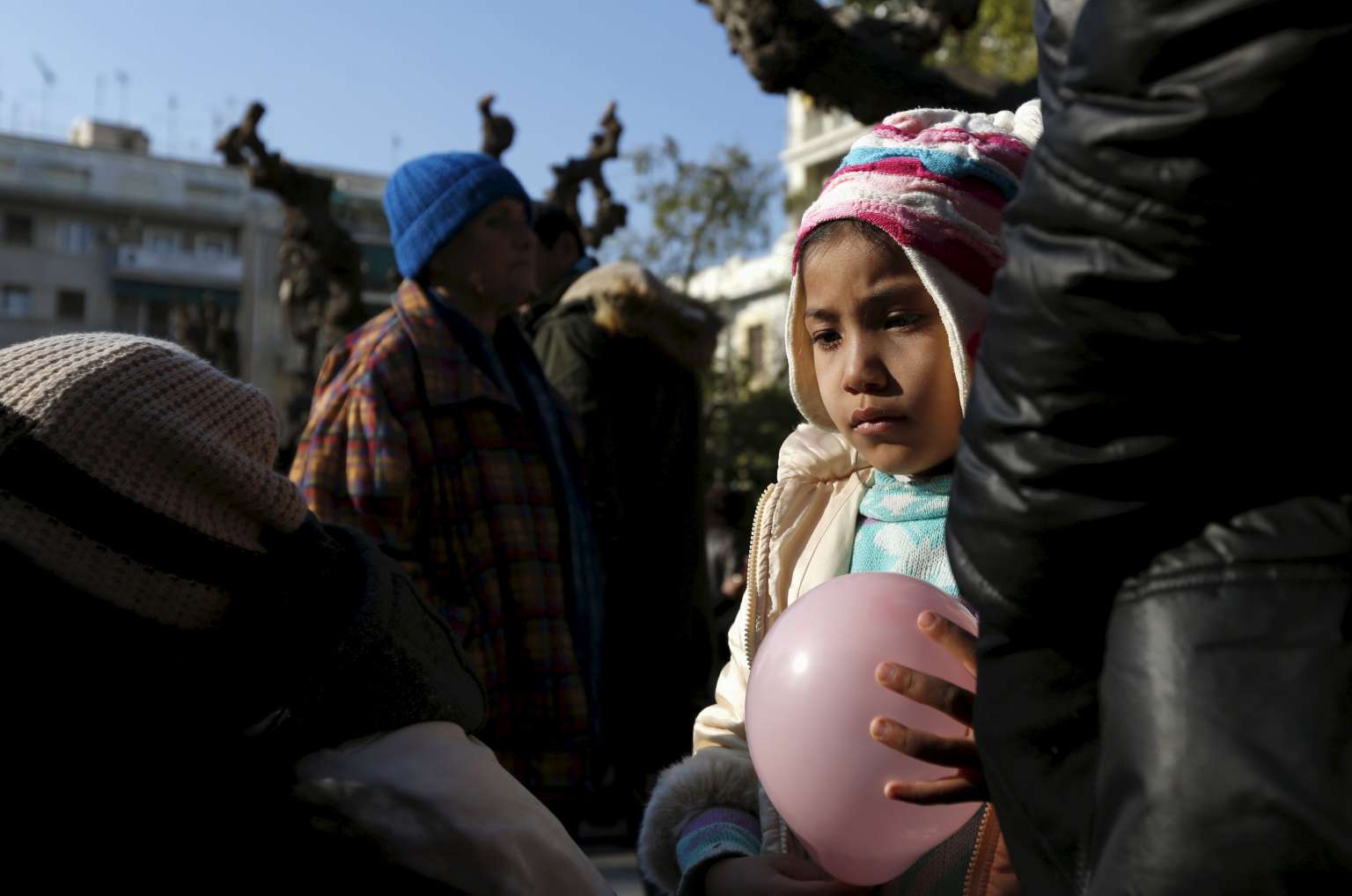 A migrant child holding a balloon in Victoria Square, Greece, on Jan 27.