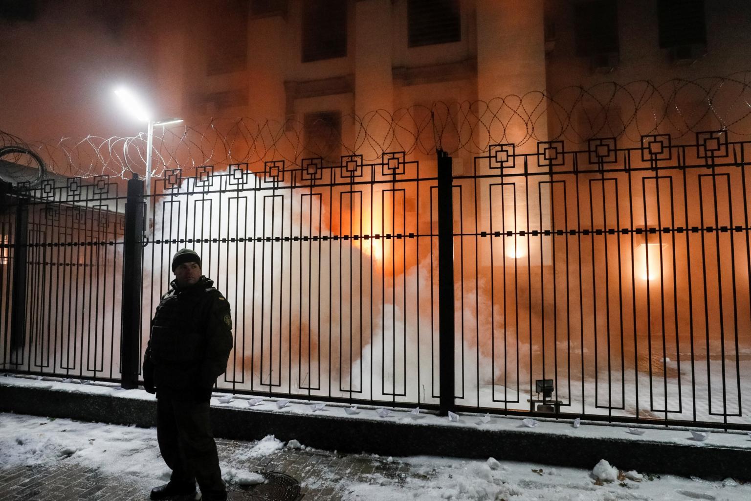 Smoke from a flare thrown by a protester is seen during a rally against the seizure by Russian special forces of three Ukrainian navy ships, in front of the Russian embassy in Kiev, Ukraine, on Nov 25, 2018.