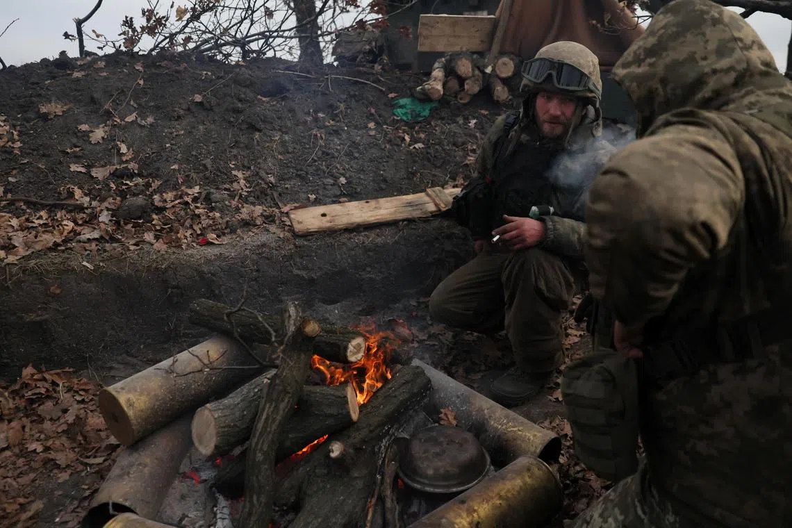 Ukrainian soldiers Roman, 38, and Sergiy, 35, keep warm by a fire to stave off the bitter cold, while waiting for coordinates to strike a Russian military target, near Bakhmut in Ukraine, on Dec 3, 2022.