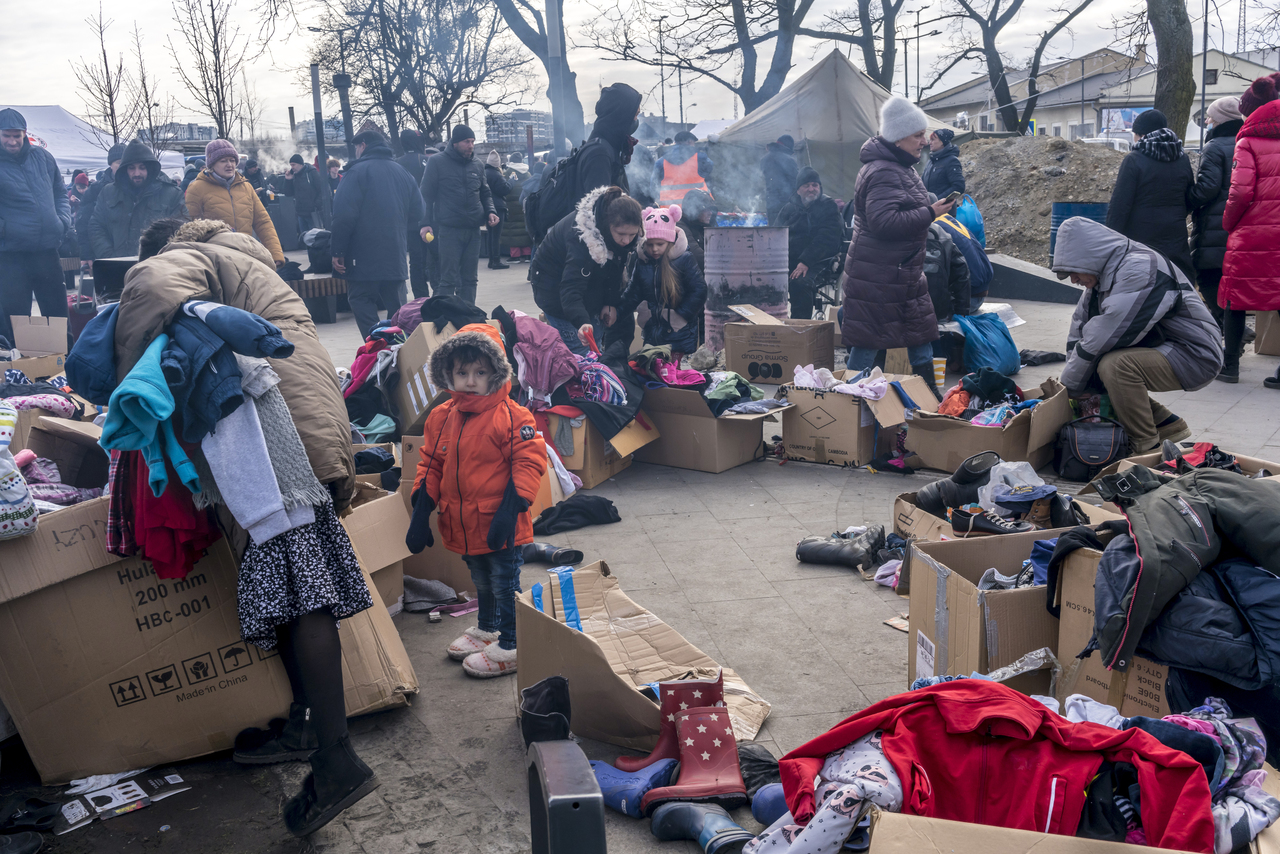 People pick up donated clothing outside the central train station in Lviv, Ukraine, on March 9, 2022.