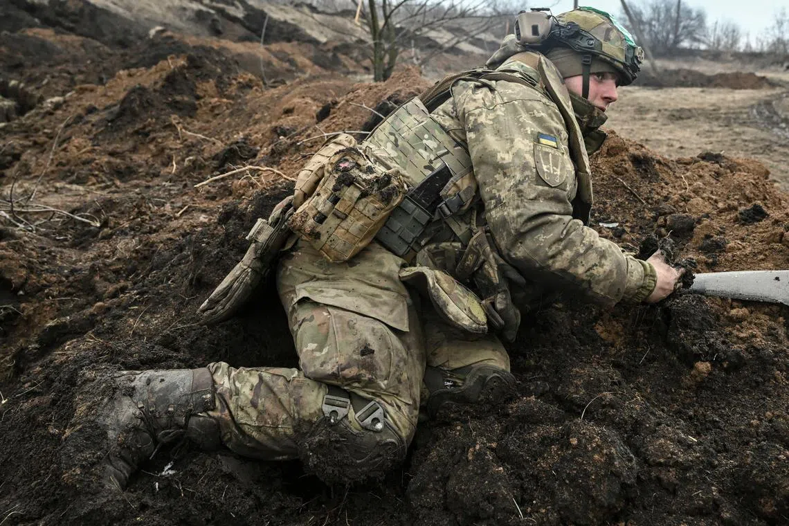 A Ukrainian serviceman takes cover during shelling, near the city of Bakhmut, on March 8, 2023.