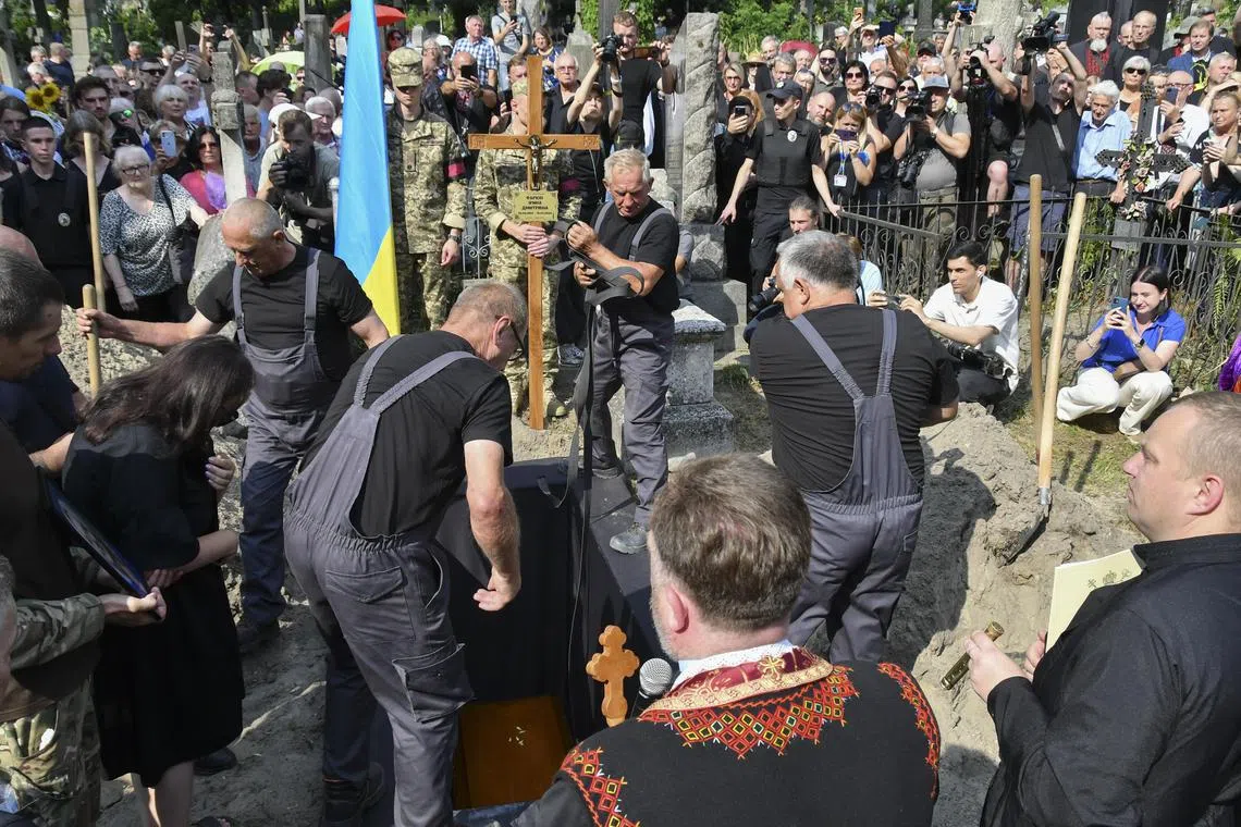 Ukrainians attend the funeral of former MP Iryna Farion at the Lychakivske cemetery in Lviv, Ukraine.