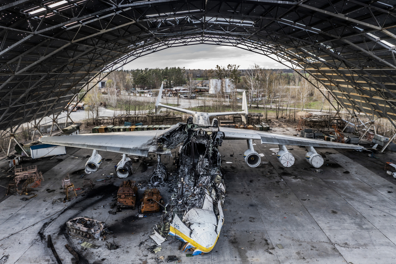 The wreckage of Mriya, formerly the world's largest cargo aircraft, at the Antonov airfield in Hostomel, near Kyiv.