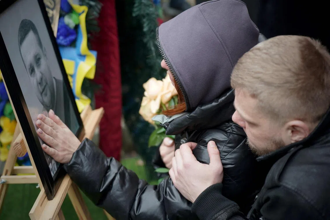 Relatives grieve at the funeral of Mykhaylo Korenovsky, a Ukrainian boxing coach who died in the missile strike on a residential building in Dnipro.