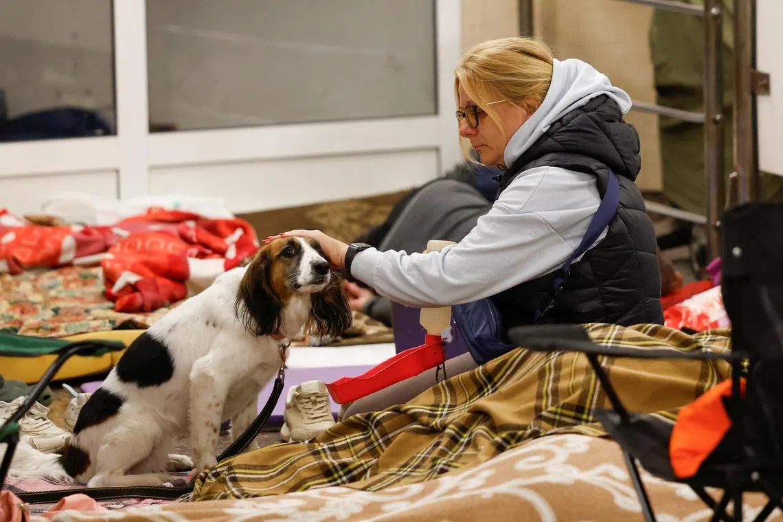 A woman petting a dog while sheltering inside a metro station in Kyiv, Ukraine, during a Russian military strike on June 29.