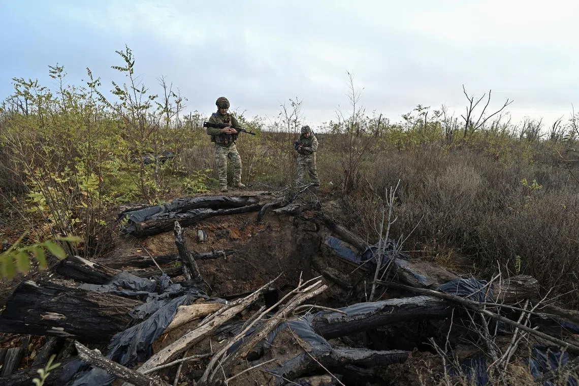 Ukrainian servicemen inspect a former Russian position outside the village of Robotyne, in Ukraine’s Zaporizhzhia region, in November 2023.