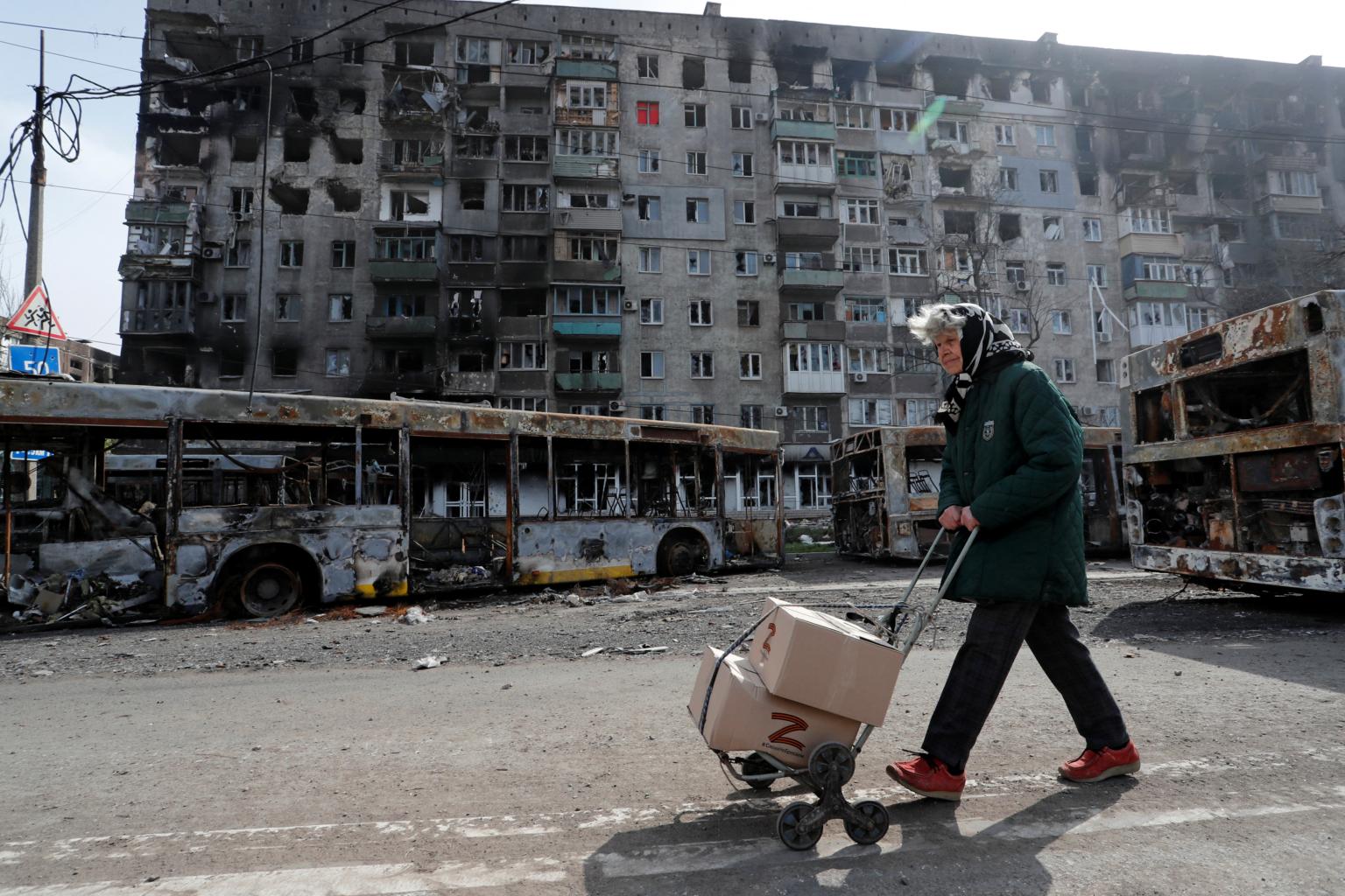 A local resident walks past a damaged apartment building in the Mariupol, Ukraine, on April 19, 2022.
