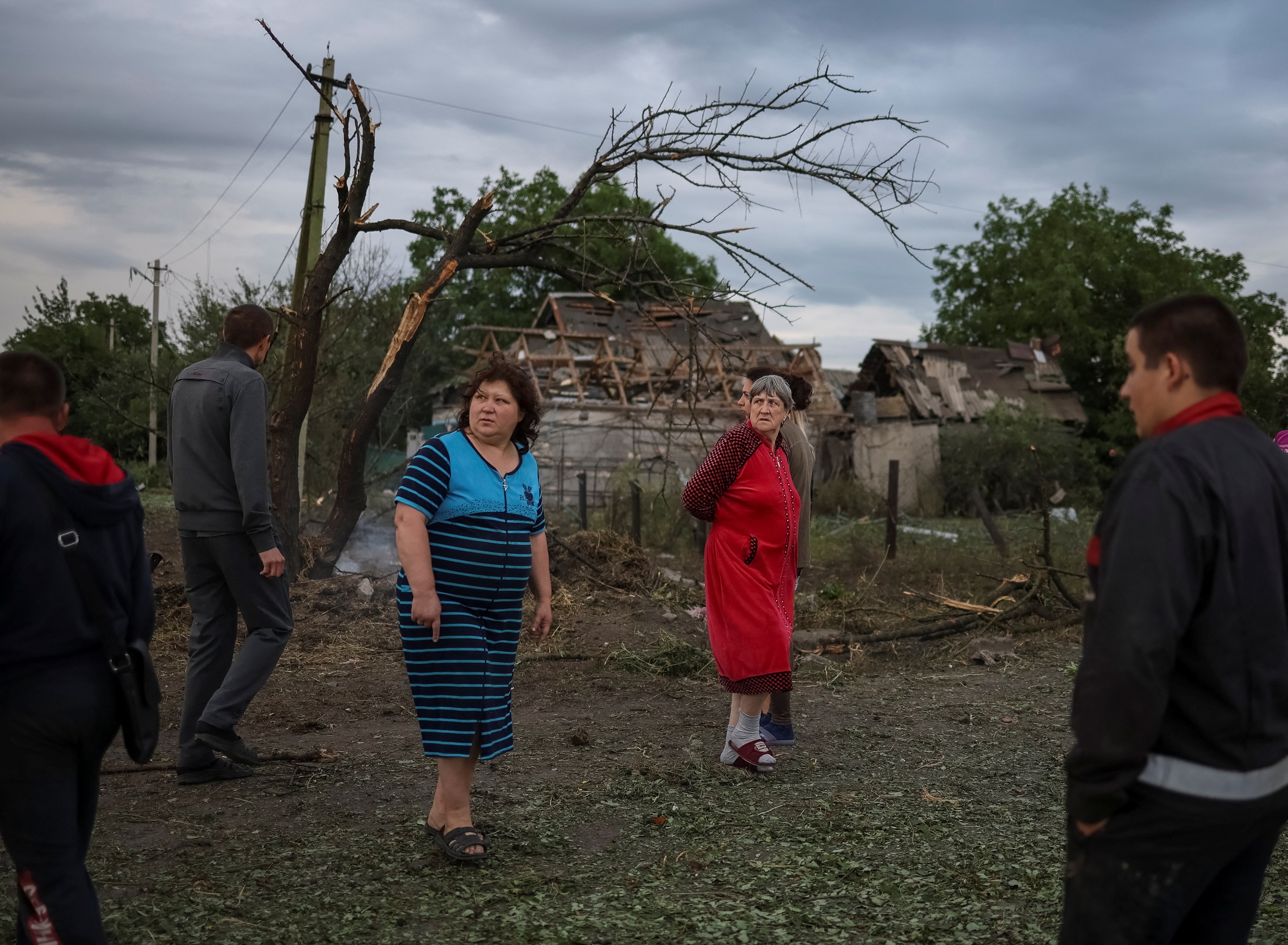 Local residents check out buildings destroyed by Russian missile strikes, in the town of Pokrovsk, in Ukraine's Donetsk region, on June 15, 2022.