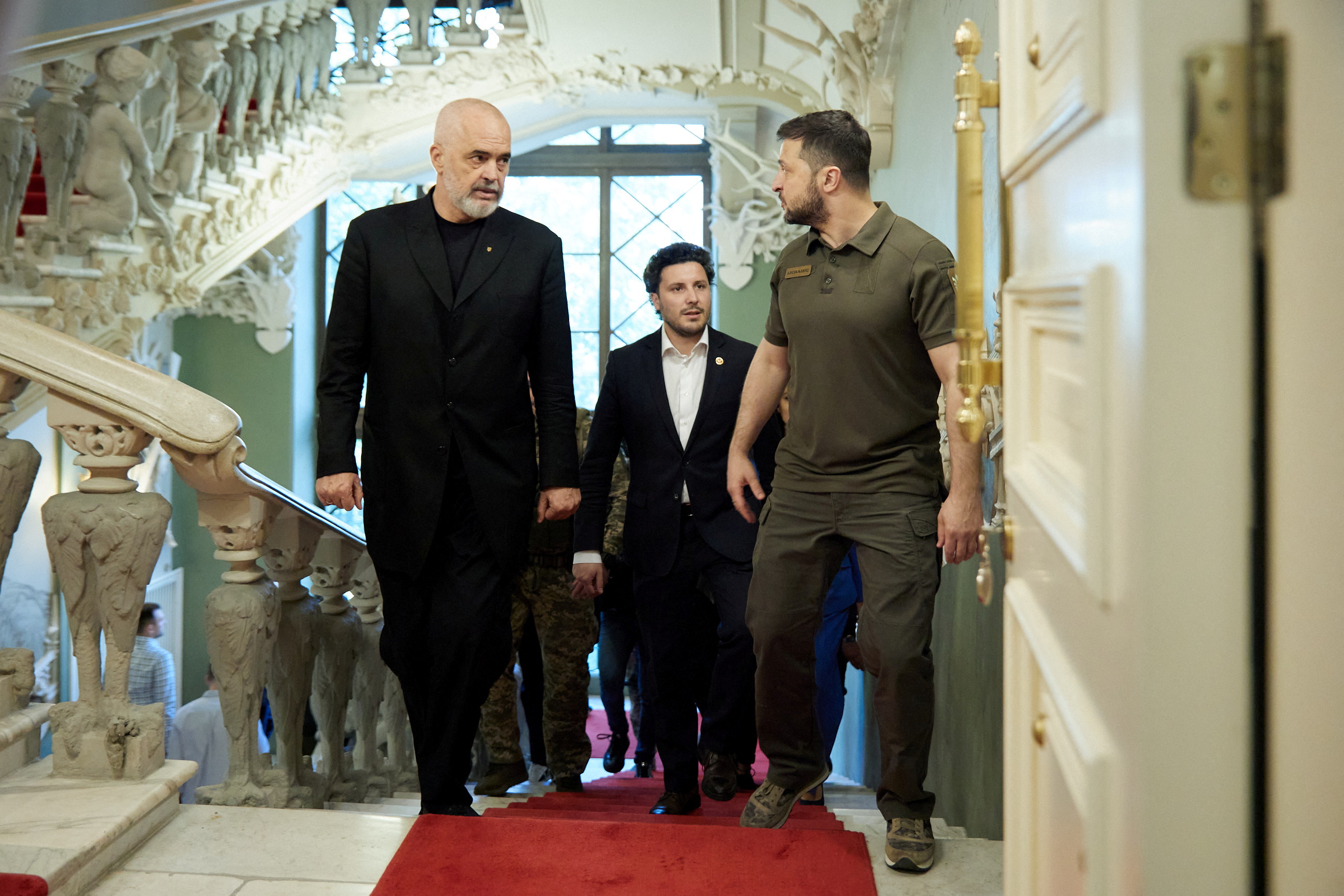 Ukrainian President Volodymyr Zelensky (right) meets in Kyiv with Albanian Prime Minister Edi Rama (left) and Prime Minister of Montenegro Dritan Abazovic, on June 15, 2022.