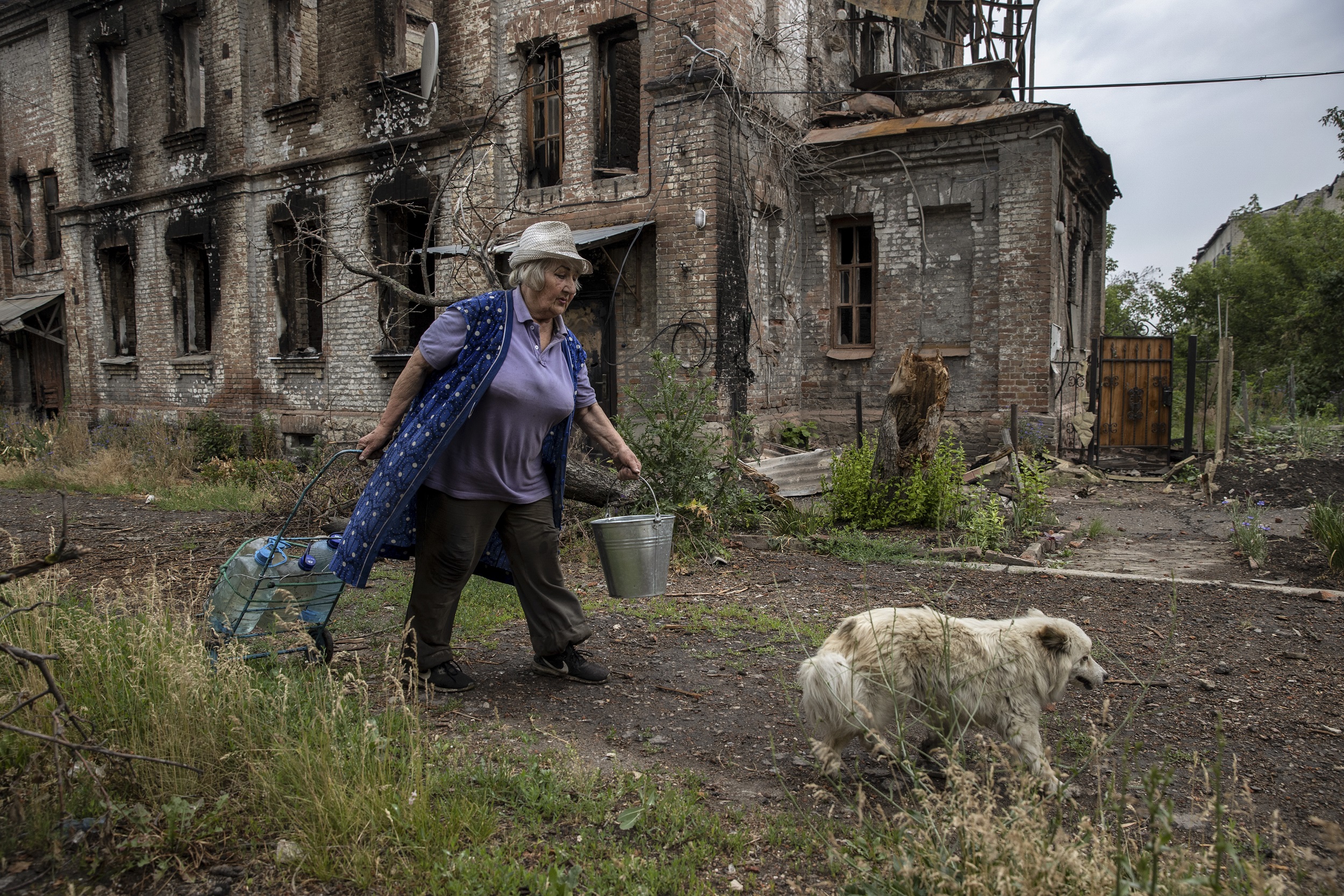 A resident carries water past destroyed buildings in Lysychansk, in the Donetsk region of Ukraine, on June 15, 2022.