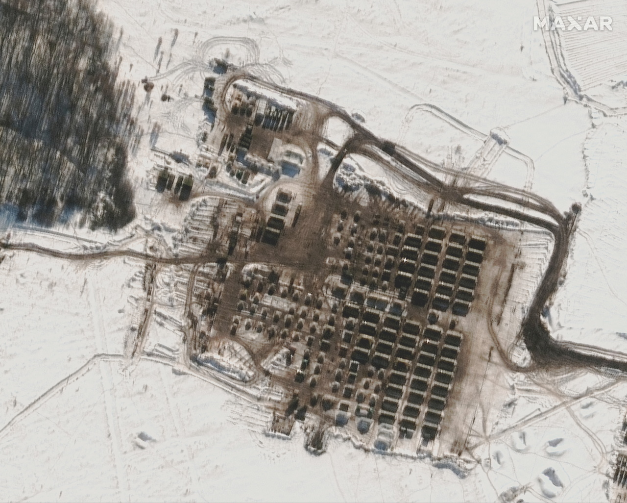 <p>A satellite image shows tents and troop housing area in Kursk Training Area, Russia, February 9, 2022. 2022 Maxar Technologies/Handout via REUTERS ATTENTION EDITORS - THIS IMAGE HAS BEEN SUPPLIED BY A THIRD PARTY. NO RESALES. NO ARCHIVES. MANDATORY CREDIT. DO NOT OBSCURE LOGO</p>