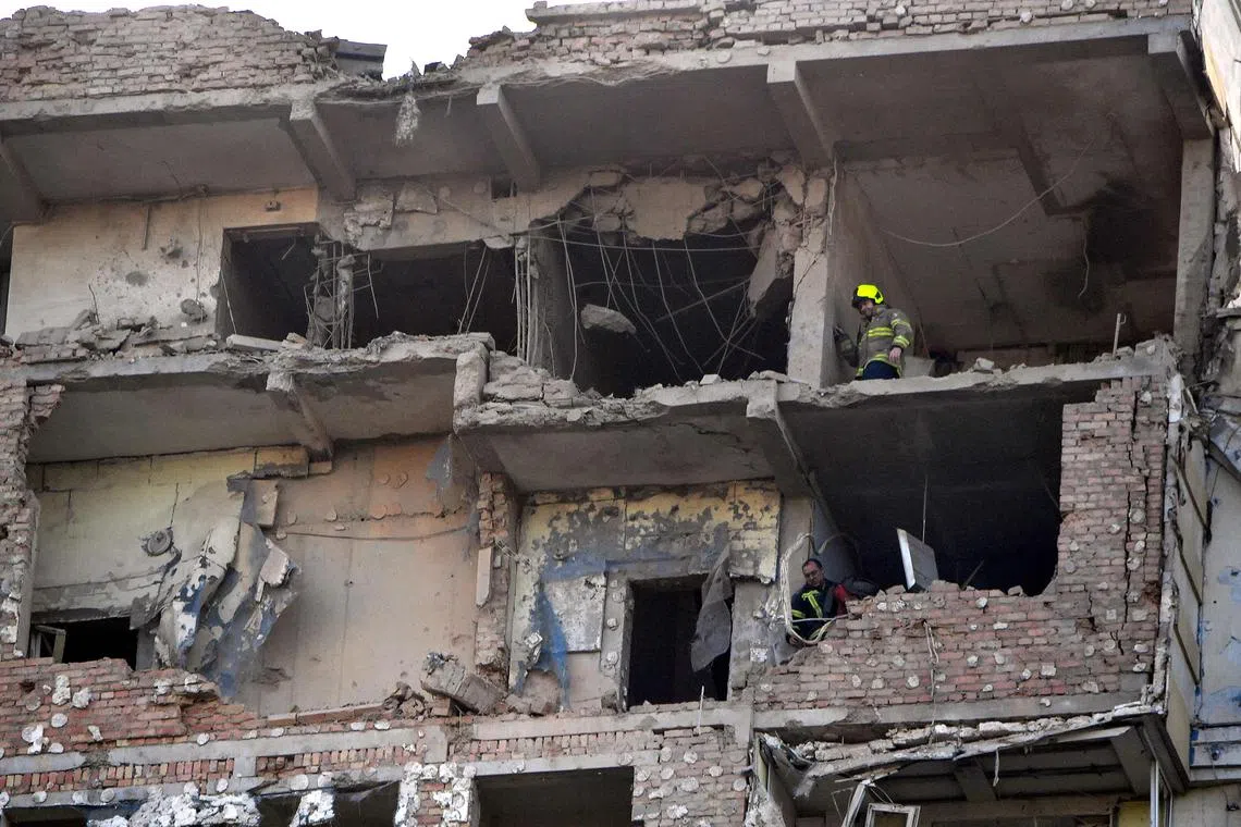 Rescuers working in a residential building that was damaged by drone attacks, in Kyiv, Ukraine, on May 30, 2023.