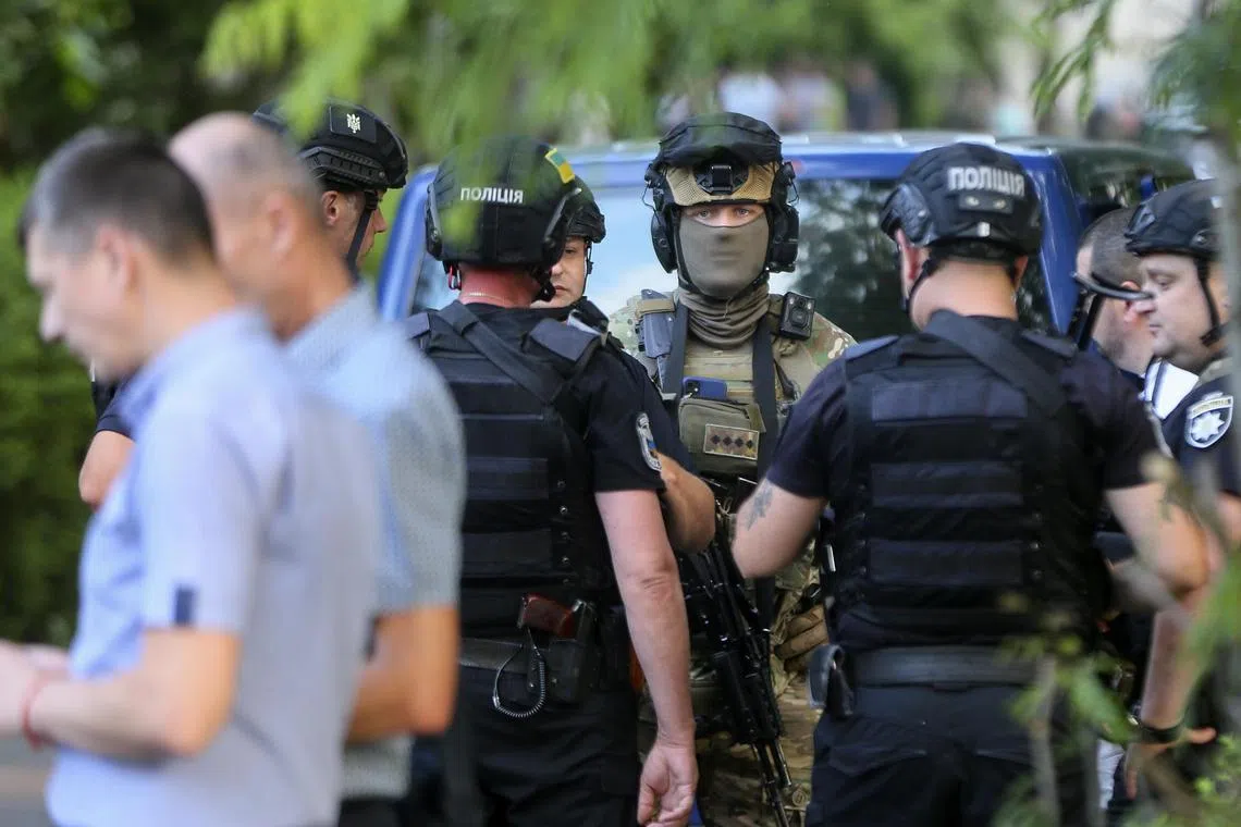 Ukrainian police officers keep watch outside, after an explosion at the Shevchenkivskyi court, in Kyiv.