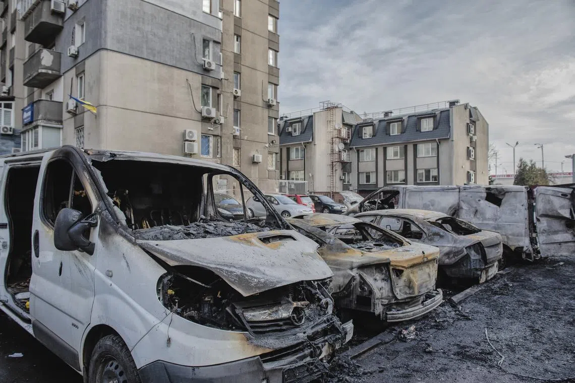 Damaged vehicles where missile parts fell onto a residential parking lot in the Sviatoshynskyi district of Kyiv, March 9, 2023.