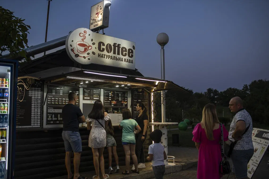 People buying coffee and drinks at a stand inside Voznesenivskyy Park in Zaporizhzhia, Ukraine, on Aug 5, 2023.