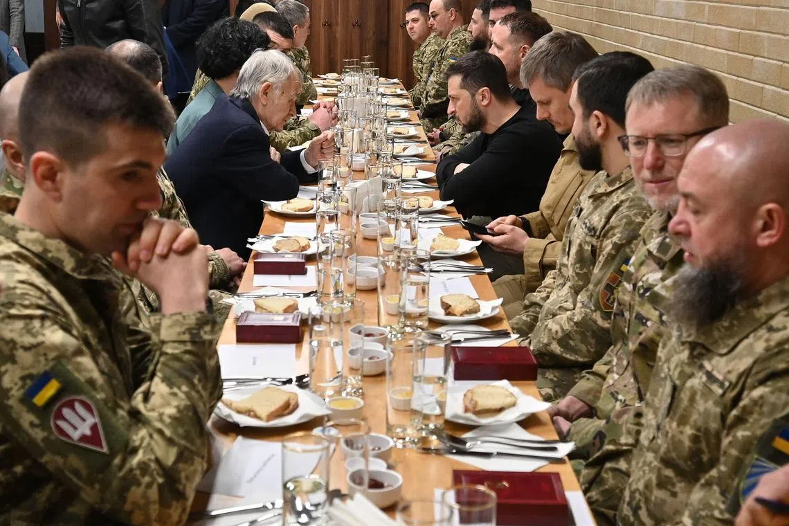 Ukrainian President Volodymyr Zelensky (centre right) attends an iftar meal with Muslim Ukrainian servicemen in Kyiv.