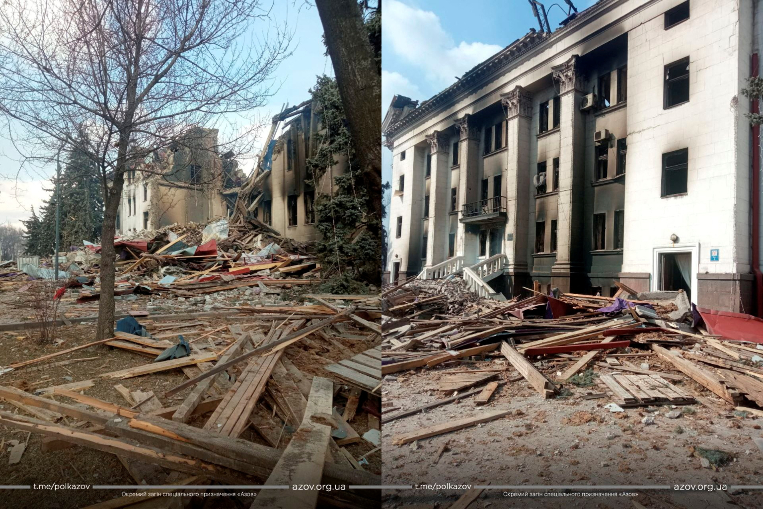 The remains of the drama theatre hit by a bomb when hundreds of people were sheltering inside, in Mariupol, Ukraine, March 18, 2022.