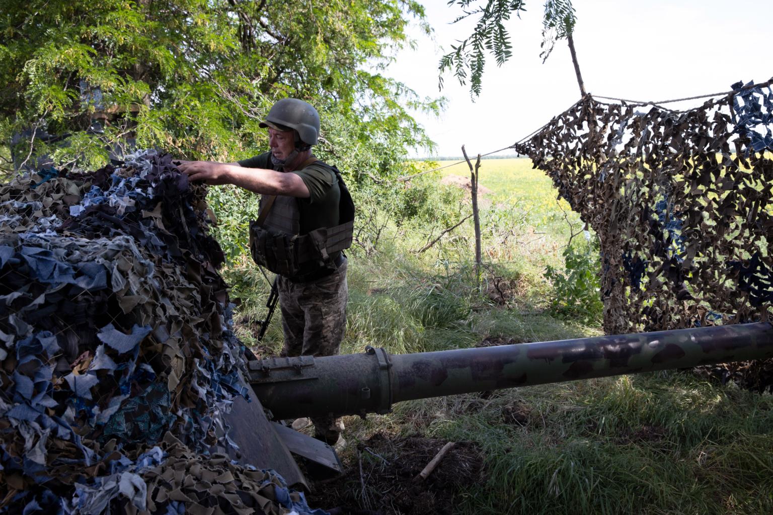 A Ukrainian soldier camouflaging an anti-tank gun near Kherson, Ukraine, on June 4, 2022.