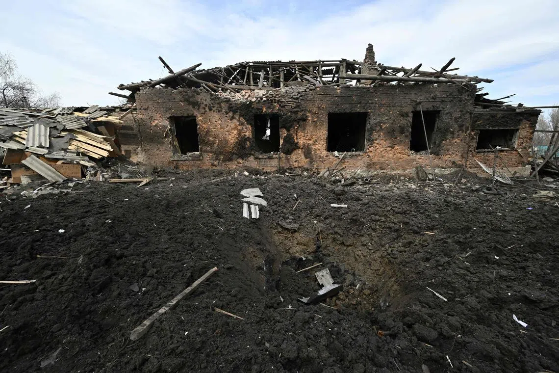 A crater is seen in front of a damaged house after a military strike on the town of Kostyantynivka, Donetsk region, on April 2, 2023.