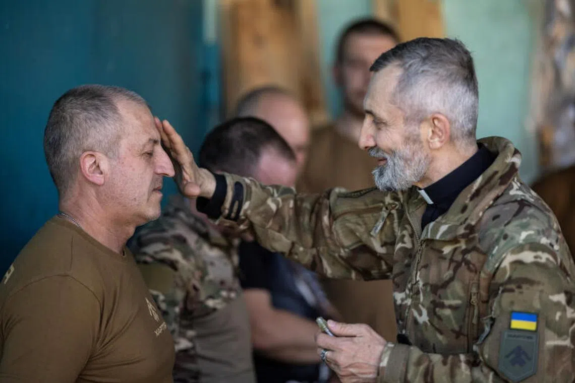 Military chaplain conducts Easter service for Ukrainian service members near a front line in Kharkiv region.