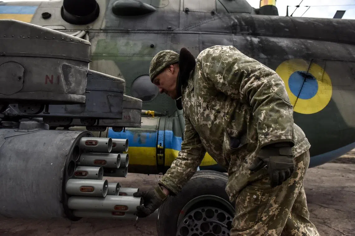 A Ukrainian serviceman loads rockets onto an MI-8 helicopter at an undisclosed location in eastern Ukraine.