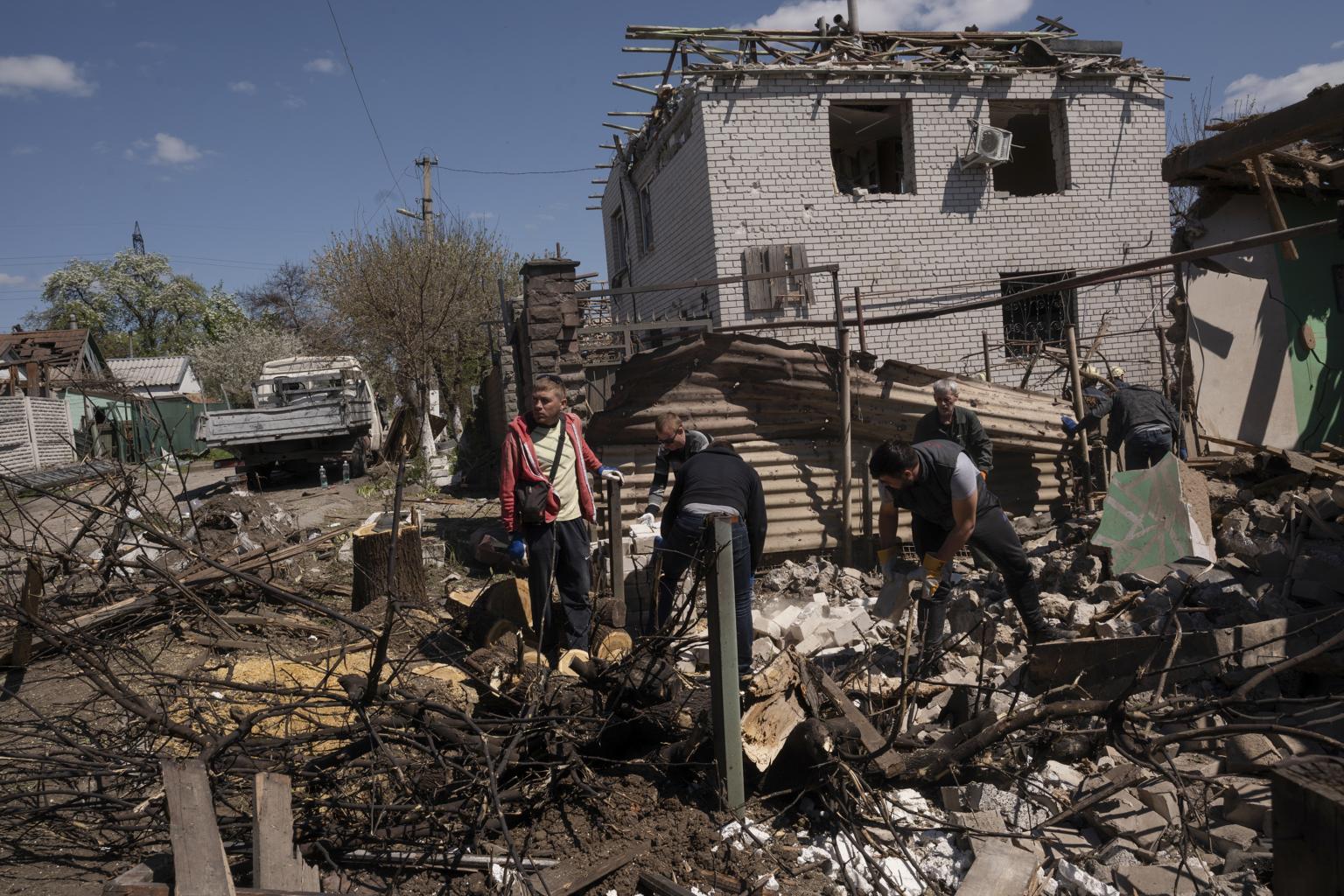 Residents clean up the aftermath of an airstrike in a residential neighbourhood in Zaporizhzhia, Ukraine, on April 28, 2022.