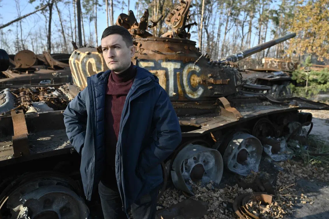 Co-founder of War Tours Dmytro Nykyforov standing next to a destroyed Russian tank, during a tour near Dmytrivka village, outside Kyiv, on Nov 7.