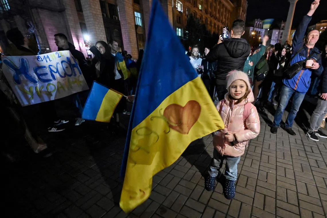 A child holds a Ukranian flag as people gather in Maidan square to celebrate the liberation of Kherson, in Kyiv on Nov 11, 2022.