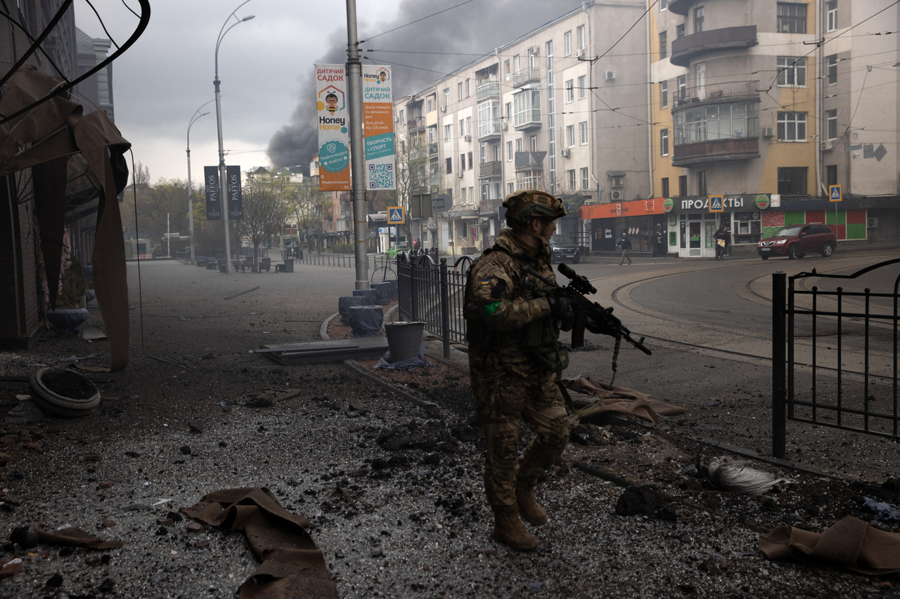 A Ukrainian soldier on the street following a rocket barrage that struck central Kharkiv, Ukraine, on April 17, 2022.