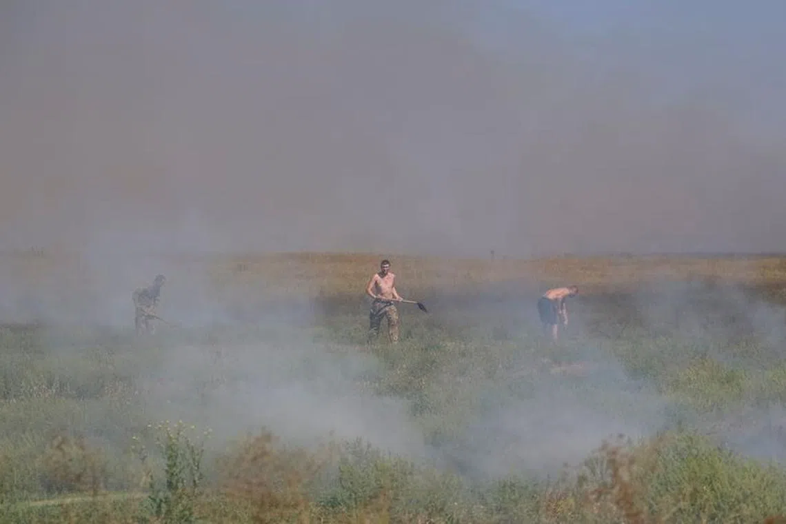 Ukrainian servicemen put out burning grass near their positions in the Zaporizhzhia region.
