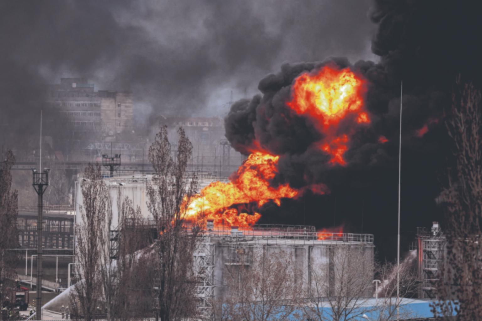 An oil refinery in Odessa, Ukraine, on fire after a missile attack on April 3, 2022.