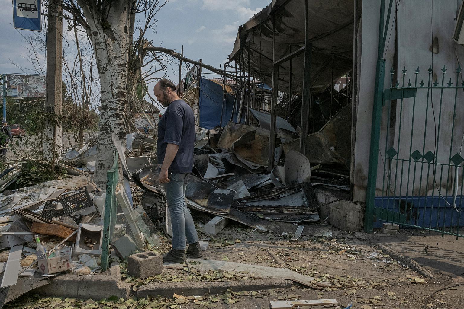 A resident walks by the entrance of a destroyed bazaar hit by shelling in Bakhmut, Ukraine, on July 16, 2022.