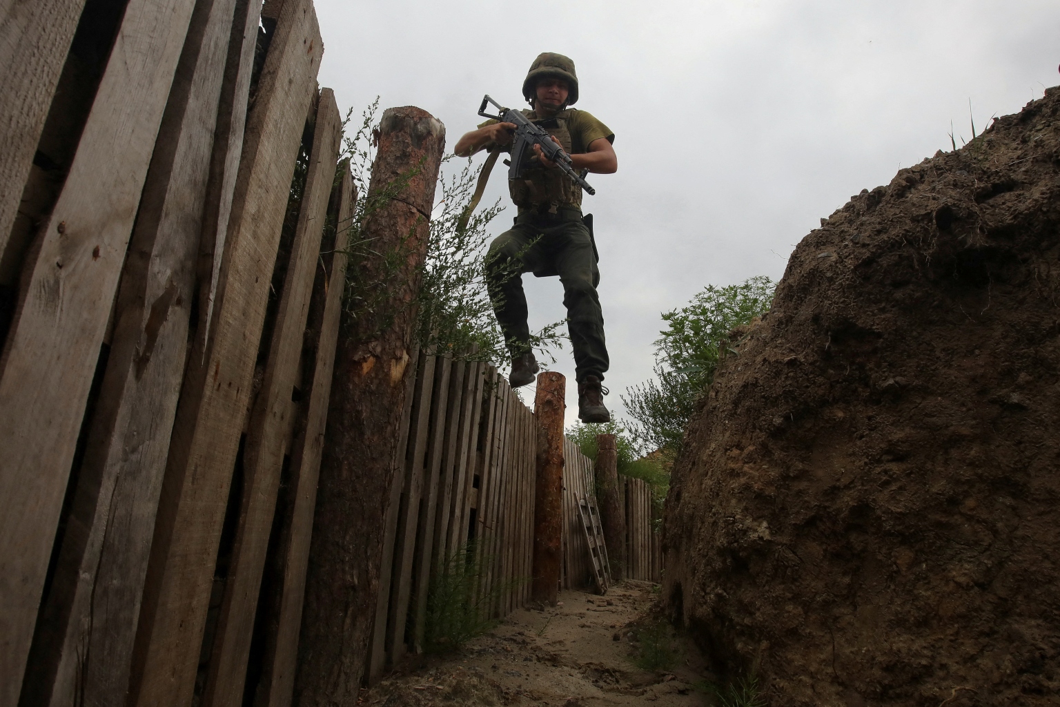 A member of the Ukrainian army jumps into a trench in Kharkiv region, Ukraine, on Aug 3, 2022.