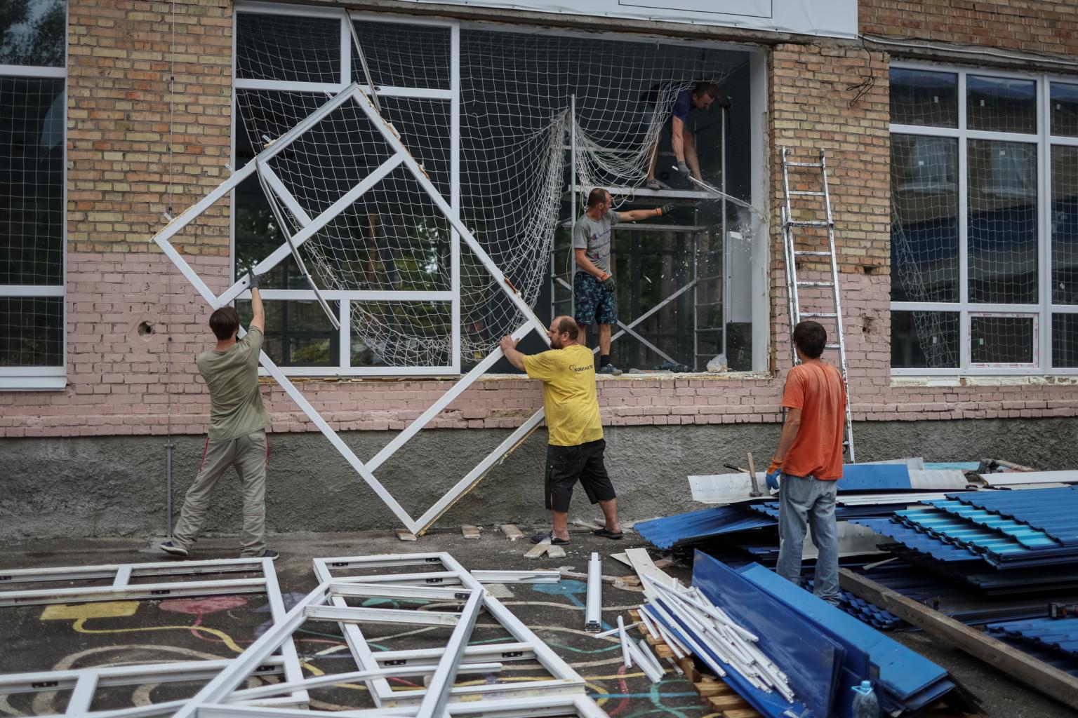 Workers replace windows blown out during a Russian artillery attack at a school in Irpin, near Kyiv, on Aug 10, 2022.