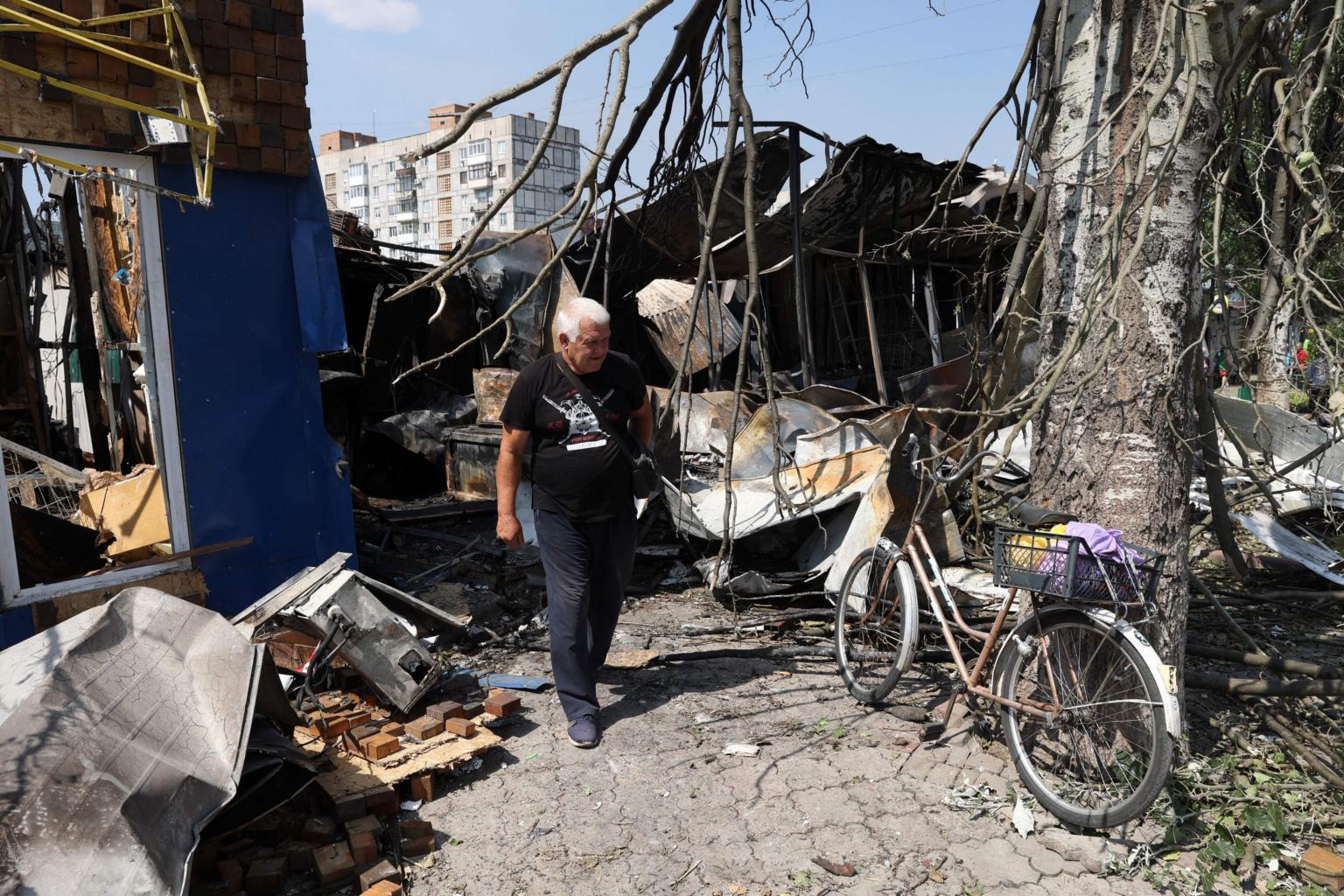 A man walks among the debris of a destroyed local market in the town of Bakhmut, Ukraine, on July 16, 2022.