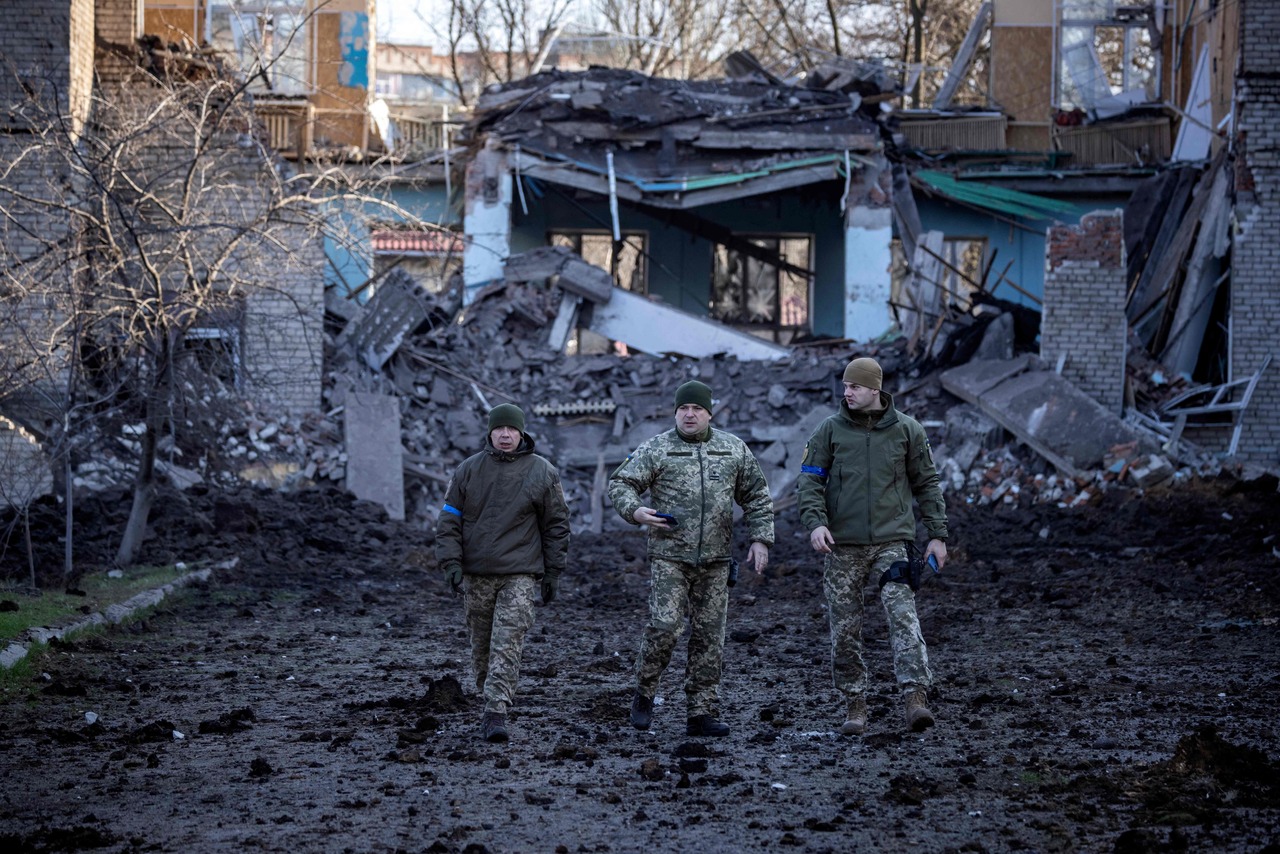 Servicemen walk near a damaged school in Kramatorsk, Donbas Region of eastern Ukraine, on April 5, 2022.